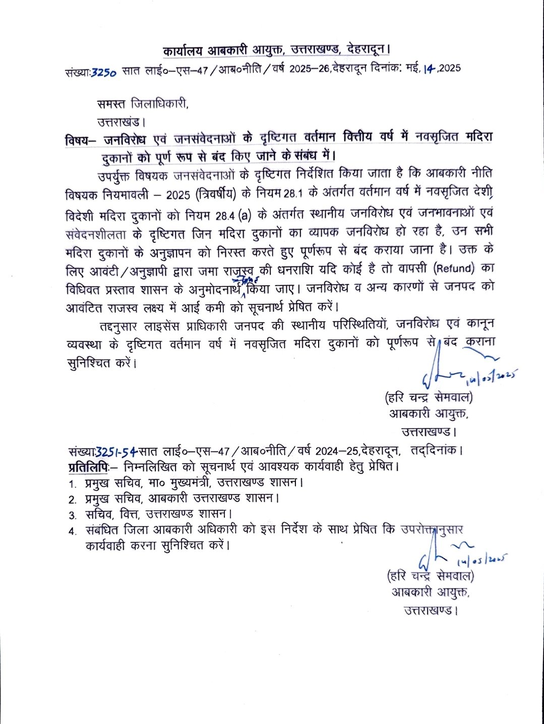 देहरादून: उत्तराखंड नई आबकारी नीति के अनुसार वित्तीय वर्ष 2025-26 में सरकार द्वारा उन शराब की दुकानों को परमानेंट बंद करने के निर्देश जारी कर दिए हैं, जहां हर बार स्थानीय लोगों का विरोध देखने को मिलता है. 14 मई शाम आबकारी आयुक्त हरि चंद्र सेमवाल ने इस संबंध में सभी जिला आबकारी अधिकारियों को पत्र जारी किया है. जिसमें उन्होंने सभी जिलों के जिला आबकारी अधिकारियों से इस संबंध में सूचना मांगी है कि उनके जिलों में कितनी ऐसी शराब की दुकानें हैं? जहां पर हर वित्तीय वर्ष में शराब की दुकान खोले जाने पर स्थानीय लोगों का विरोध होता है.