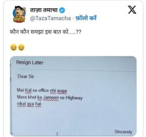ये वायरल पोस्ट X प्लेटफॉर्म के @tazatamacha नाम के अकाउंट से पोस्ट किया गया। पोस्ट में एक सख्श ने लिखा,”डियर सर में कल से ऑफिस नहीं आऊंगा, मेरे खेत की जमीन से हाइवे निकल गया है”।